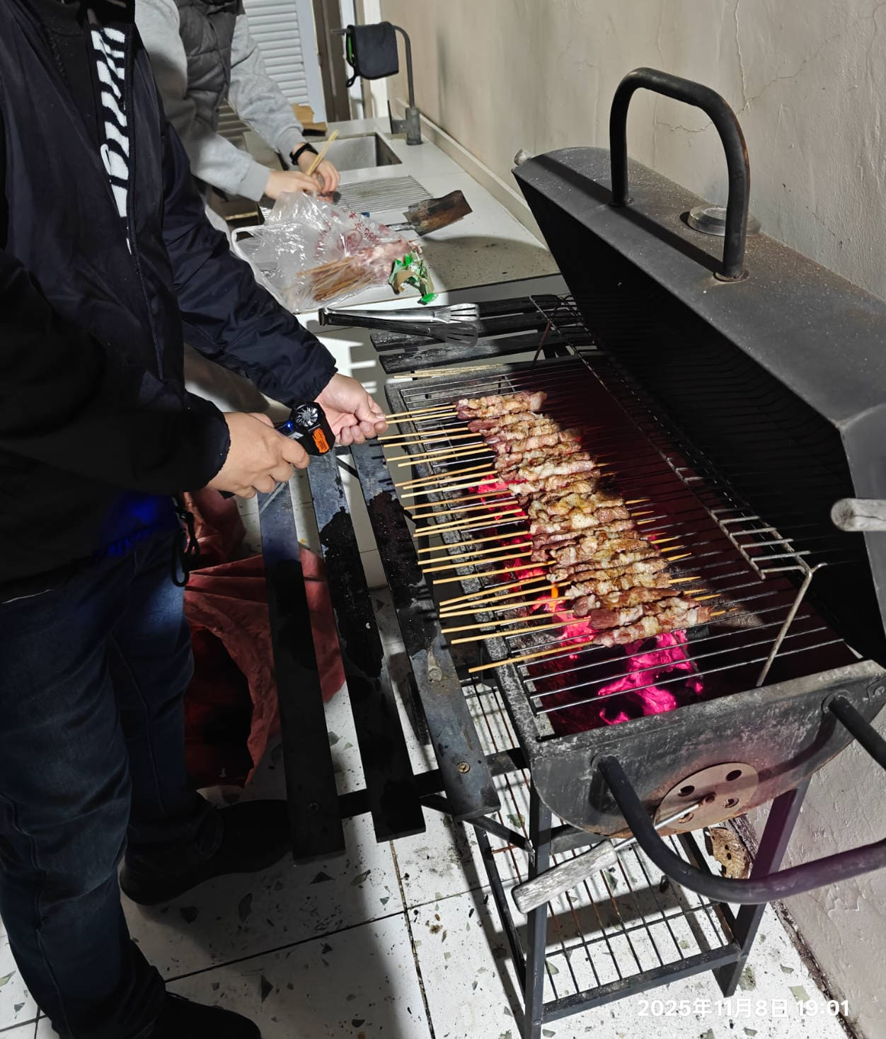11 月 8 日晚 7 时,经过团长 “百里夜路” 安全驾驶,众人抵达会议指定下榻点,此时胡老板已克服 “与大运斗智斗勇” 的路途挑战驱车赶来,全员顺利会师。作为 “后勤总指挥”,胡老板身先士卒担任首席烤师,以精湛技艺将新鲜羊肉制成美味烤串,赢得众人一致称赞:“嗯,oc!这口感配得上‘世界一番’的食材,新发地没白跑!” 餐后,胡老板带领众人转入 “学术延伸交流”—— 地下 KTV 房,在一曲《干杯》中深化情谊,众人纷纷表示:“一天掰成三天用,这种并肩奋斗的感觉最珍贵!”
