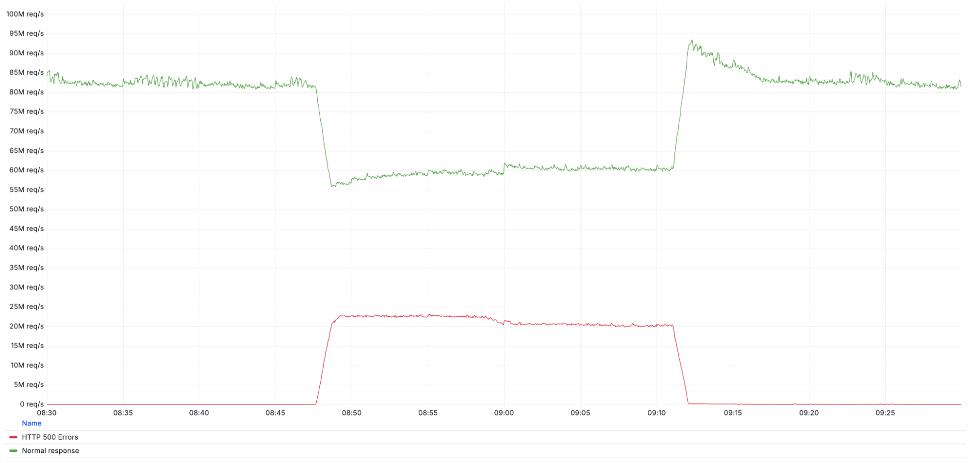 下图展示了事件期间Cloudflare网络返回的HTTP 500错误请求量(底部红线),并与未受影响的Cloudflare整体流量(顶部绿线)进行了对比。